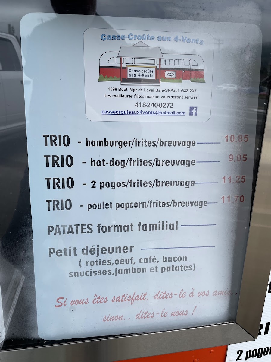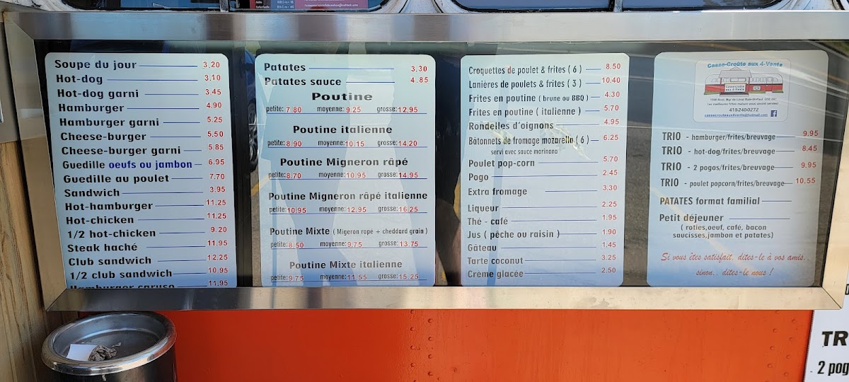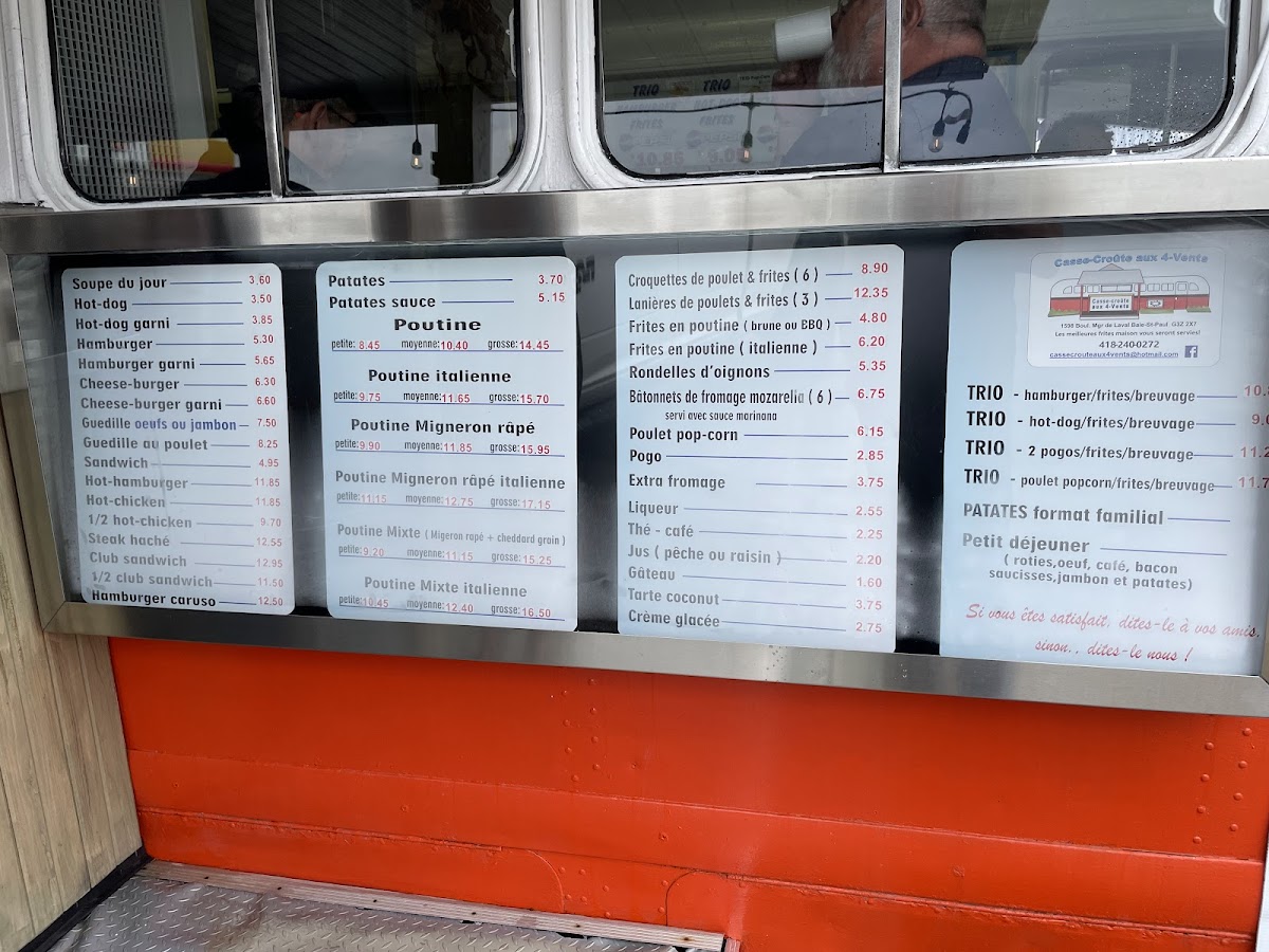 With its wide array of choices, Casse-Croûte Aux 4 Vents provides a welcoming menu for all tastes, combining classic comfort food with delicious local specialties.